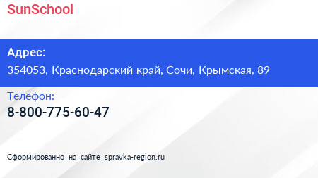 SunSchool по адресу 354053, Краснодарский край, Сочи, Крымская, 89 в дальнейшем Организация, размещена в следующих категориях: