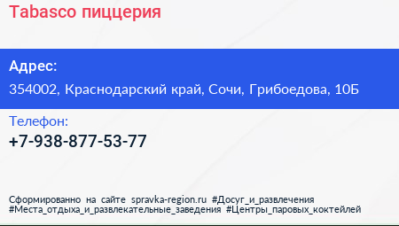 Tabasco, пиццерия по адресу 354002, Краснодарский край, Сочи, Грибоедова, 10Б в дальнейшем Организация, размещена в следующих категориях:
