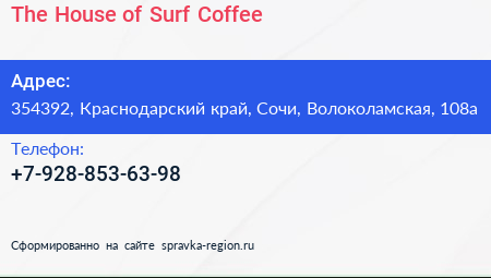 The House of Surf Coffee по адресу 354392, Краснодарский край, Сочи, Волоколамская, 108а в дальнейшем Организация, размещена в следующих категориях: