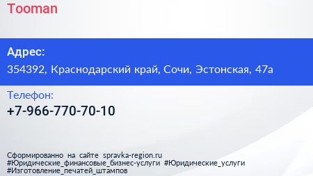 Tooman по адресу 354392, Краснодарский край, Сочи, Эстонская, 47а в дальнейшем Организация, размещена в следующих категориях: