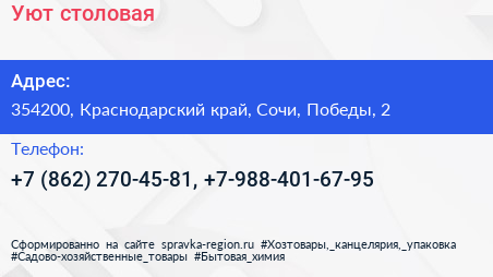 Уют, столовая по адресу 354200, Краснодарский край, Сочи, Победы, 2 в дальнейшем Организация, размещена в следующих категориях: