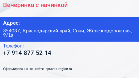 Вечеринка с начинкой по адресу 354037, Краснодарский край, Сочи, Железнодорожная, 9/1а в дальнейшем Организация, размещена в следующих категориях:
