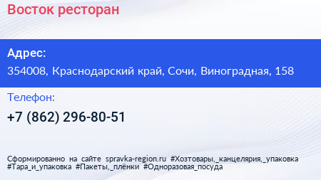 Восток, ресторан по адресу 354008, Краснодарский край, Сочи, Виноградная, 158 в дальнейшем Организация, размещена в следующих категориях: