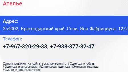 Ателье по адресу 354002, Краснодарский край, Сочи, Яна Фабрициуса, 12/2 в дальнейшем Организация, размещена в следующих категориях: