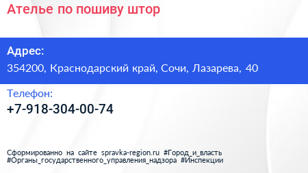 Ателье по пошиву штор по адресу 354200, Краснодарский край, Сочи, Лазарева, 40 в дальнейшем Организация, размещена в следующих категориях: