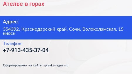 Ателье в горах по адресу 354392, Краснодарский край, Сочи, Волоколамская, 15 киоск в дальнейшем Организация, размещена в следующих категориях: