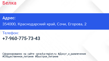 Белка по адресу 354000, Краснодарский край, Сочи, Егорова, 2 в дальнейшем Организация, размещена в следующих категориях: