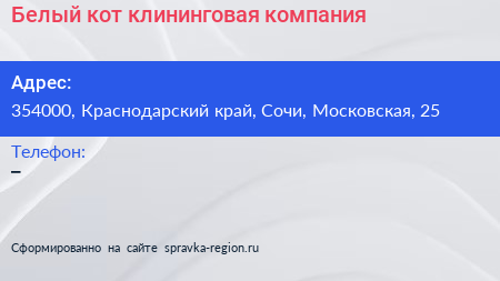 Белый кот, клининговая компания по адресу 354000, Краснодарский край, Сочи, Московская, 25 в дальнейшем Организация, размещена в следующих категориях: