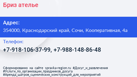 Бриз, ателье по адресу 354000, Краснодарский край, Сочи, Кооперативная, 4а в дальнейшем Организация, размещена в следующих категориях: