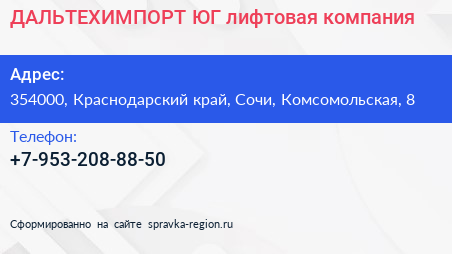 ДАЛЬТЕХИМПОРТ-ЮГ, лифтовая компания по адресу 354000, Краснодарский край, Сочи, Комсомольская, 8 в дальнейшем Организация, размещена в следующих категориях: