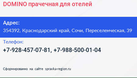DOMINO, прачечная для отелей по адресу 354392, Краснодарский край, Сочи, Переселенческая, 39 в дальнейшем Организация, размещена в следующих категориях: