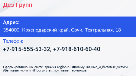 Дез Групп по адресу 354000, Краснодарский край, Сочи, Театральная, 18 в дальнейшем Организация, размещена в следующих категориях: