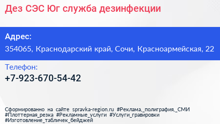 Дез-СЭС-Юг, служба дезинфекции по адресу 354065, Краснодарский край, Сочи, Красноармейская, 22 в дальнейшем Организация, размещена в следующих категориях: