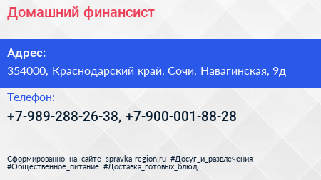 Домашний финансист по адресу 354000, Краснодарский край, Сочи, Навагинская, 9д в дальнейшем Организация, размещена в следующих категориях: