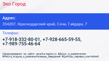 Эко-Город по адресу 354207, Краснодарский край, Сочи, Гайдара, 7 в дальнейшем Организация, размещена в следующих категориях: