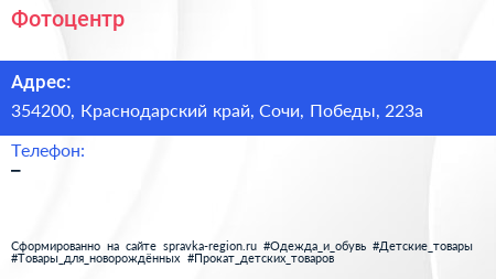 Фотоцентр по адресу 354200, Краснодарский край, Сочи, Победы, 223а в дальнейшем Организация, размещена в следующих категориях: