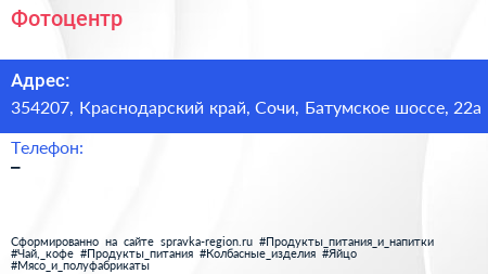 Фотоцентр по адресу 354207, Краснодарский край, Сочи, Батумское шоссе, 22а в дальнейшем Организация, размещена в следующих категориях: