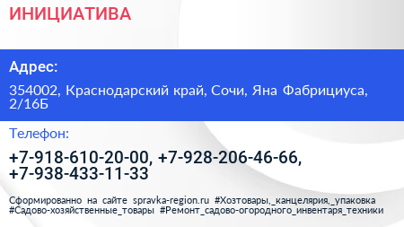 ИНИЦИАТИВА по адресу 354002, Краснодарский край, Сочи, Яна Фабрициуса, 2/16Б в дальнейшем Организация, размещена в следующих категориях: