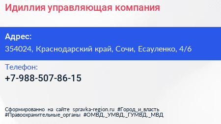 Идиллия, управляющая компания по адресу 354024, Краснодарский край, Сочи, Есауленко, 4/6 в дальнейшем Организация, размещена в следующих категориях:
