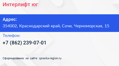 Интерлифт-юг по адресу 354002, Краснодарский край, Сочи, Черноморская, 15 в дальнейшем Организация, размещена в следующих категориях: