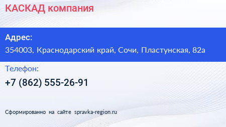 КАСКАД, компания по адресу 354003, Краснодарский край, Сочи, Пластунская, 82а в дальнейшем Организация, размещена в следующих категориях: