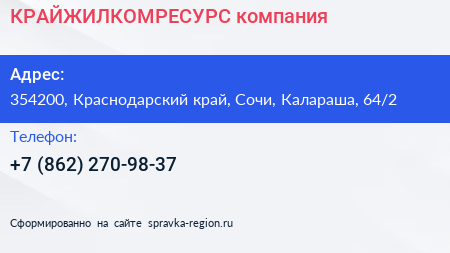 КРАЙЖИЛКОМРЕСУРС, компания по адресу 354200, Краснодарский край, Сочи, Калараша, 64/2 в дальнейшем Организация, размещена в следующих категориях:
