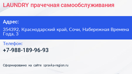 LAUNDRY, прачечная самообслуживания по адресу 354392, Краснодарский край, Сочи, Набережная Времена Года, 3 в дальнейшем Организация, размещена в следующих категориях: