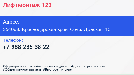 Лифтмонтаж-123 по адресу 354068, Краснодарский край, Сочи, Донская, 10 в дальнейшем Организация, размещена в следующих категориях: