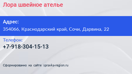 Лора, швейное ателье по адресу 354066, Краснодарский край, Сочи, Дарвина, 22 в дальнейшем Организация, размещена в следующих категориях: