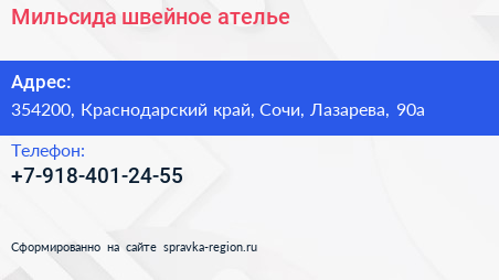 Мильсида, швейное ателье по адресу 354200, Краснодарский край, Сочи, Лазарева, 90а в дальнейшем Организация, размещена в следующих категориях: