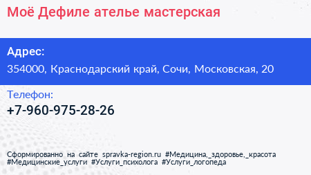 Моё Дефиле, ателье-мастерская по адресу 354000, Краснодарский край, Сочи, Московская, 20 в дальнейшем Организация, размещена в следующих категориях: