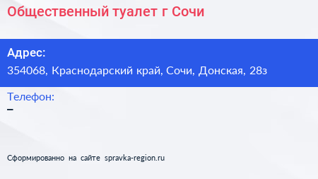 Общественный туалет, г. Сочи по адресу 354068, Краснодарский край, Сочи, Донская, 28з в дальнейшем Организация, размещена в следующих категориях: