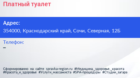 Платный туалет по адресу 354000, Краснодарский край, Сочи, Северная, 12Б в дальнейшем Организация, размещена в следующих категориях: