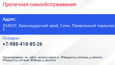 Прачечная самообслуживания по адресу 354037, Краснодарский край, Сочи, Привольный переулок, 1 в дальнейшем Организация, размещена в следующих категориях: