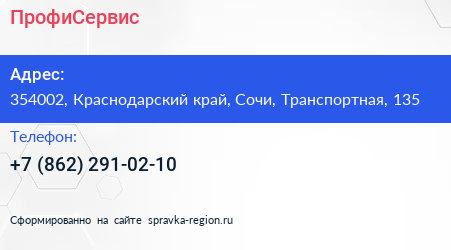 ПрофиСервис по адресу 354002, Краснодарский край, Сочи, Транспортная, 135 в дальнейшем Организация, размещена в следующих категориях: