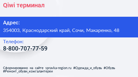 Qiwi, терминал по адресу 354003, Краснодарский край, Сочи, Макаренко, 48 в дальнейшем Организация, размещена в следующих категориях: