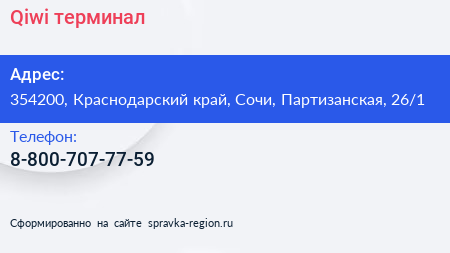 Qiwi, терминал по адресу 354200, Краснодарский край, Сочи, Партизанская, 26/1 в дальнейшем Организация, размещена в следующих категориях: