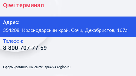 Qiwi, терминал по адресу 354208, Краснодарский край, Сочи, Декабристов, 167а в дальнейшем Организация, размещена в следующих категориях: