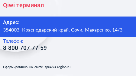 Qiwi, терминал по адресу 354003, Краснодарский край, Сочи, Макаренко, 14/3 в дальнейшем Организация, размещена в следующих категориях: