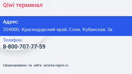Qiwi, терминал по адресу 354000, Краснодарский край, Сочи, Кубанская, 3а в дальнейшем Организация, размещена в следующих категориях: