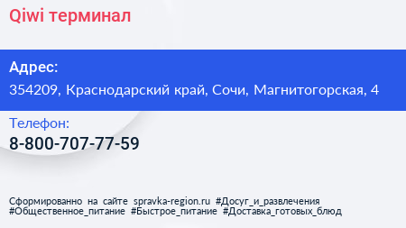 Qiwi, терминал по адресу 354209, Краснодарский край, Сочи, Магнитогорская, 4 в дальнейшем Организация, размещена в следующих категориях: