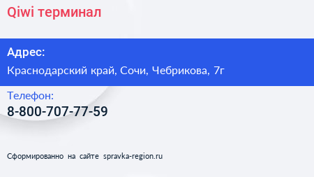 Qiwi, терминал по адресу Краснодарский край, Сочи, Чебрикова, 7г в дальнейшем Организация, размещена в следующих категориях: