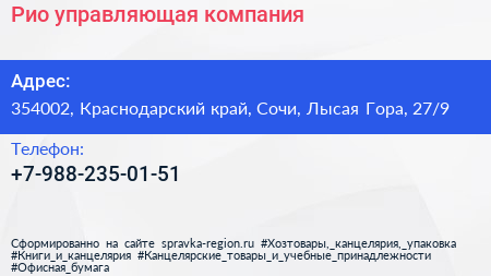 Рио, управляющая компания по адресу 354002, Краснодарский край, Сочи, Лысая Гора, 27/9 в дальнейшем Организация, размещена в следующих категориях: