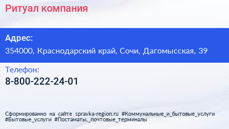 Ритуал, компания по адресу 354000, Краснодарский край, Сочи, Дагомысская, 39 в дальнейшем Организация, размещена в следующих категориях:
