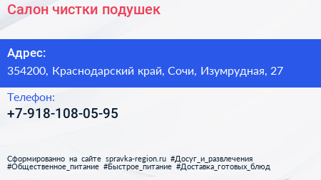 Салон чистки подушек по адресу 354200, Краснодарский край, Сочи, Изумрудная, 27 в дальнейшем Организация, размещена в следующих категориях:
