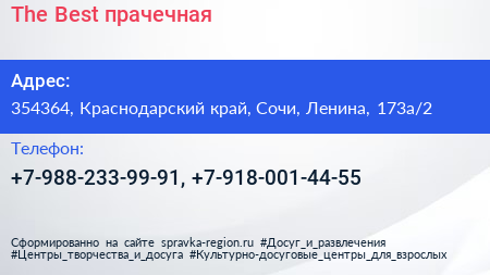 The Best, прачечная по адресу 354364, Краснодарский край, Сочи, Ленина, 173а/2 в дальнейшем Организация, размещена в следующих категориях: