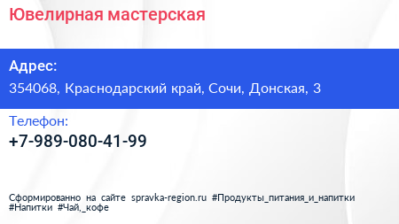 Ювелирная мастерская по адресу 354068, Краснодарский край, Сочи, Донская, 3 в дальнейшем Организация, размещена в следующих категориях: