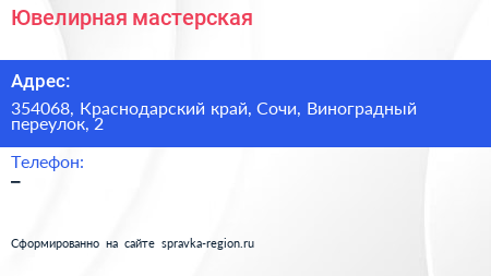 Ювелирная мастерская по адресу 354068, Краснодарский край, Сочи, Виноградный переулок, 2 в дальнейшем Организация, размещена в следующих категориях: