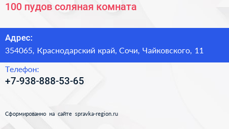 100 пудов, соляная комната по адресу 354065, Краснодарский край, Сочи, Чайковского, 11 в дальнейшем Организация, размещена в следующих категориях: