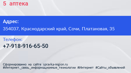 5+, аптека по адресу 354037, Краснодарский край, Сочи, Платановая, 35 в дальнейшем Организация, размещена в следующих категориях: